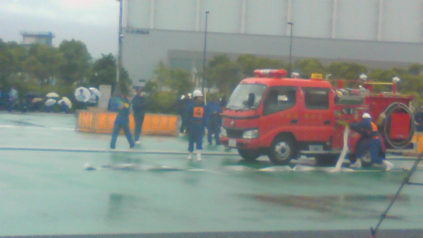 当日は悪天候で風雨の中、流石に各地区の代表らしく、全員キビキビとした演技をしていました。この日まで、勤めの合間をぬって練習に励んでこられたことが、演技の端々に出ていました。例えば、ポンプ車の乗り降りは全員一斉にするとか、ホースの繋ぎ目までの距離を憶える等々です。感激しました。