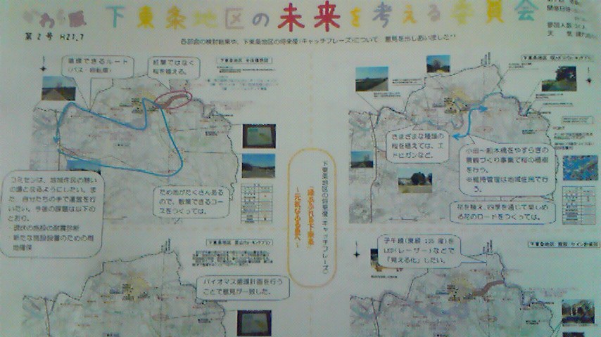 小田城跡の里山整備、下東条のコミセン施設の施設夢プラン、粟生からできている桜堤回廊をさらに下東条まで延長するプラン、文化財ウォーキングプラン、本地域に点在する「能舞台」を活用し、「ザ・農舞台」と題した農産物のフリーマーケットプランなど18件もの具体的プランが並んでいます。