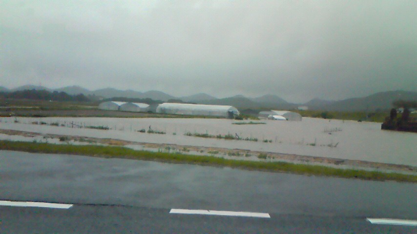 粟田橋東側の畑11時3分 ビニールハウスが浸かってしまっています。
